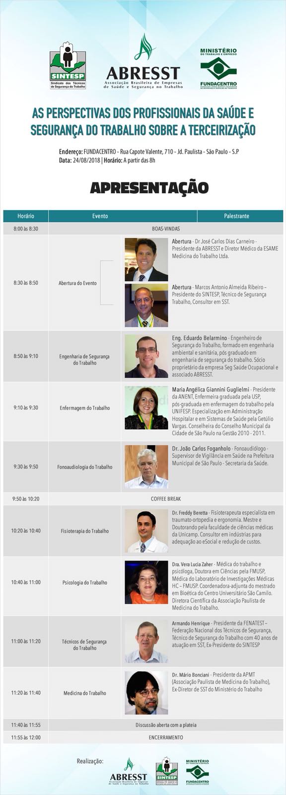 A Associação Brasileira de Empresas de Saúde e Segurança no Trabalho (ABRESST) promove, no dia 24 de agosto, o seminário “As Perspectivas dos Profissionais da Saúde e Segurança do Trabalho sobre a Terceirização”. O evento ocorrerá na sede da Fundacentro (Rua Capote Valente, 710, São Paulo – SP) de 8h às 12h e associados da ANAMT têm direito a participação gratuita.