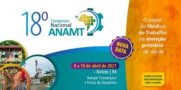 O 18º Congresso Nacional da ANAMT ganhou uma nova data: de 8 a 10 de abril de 2021, o Hangar de Convenções e Feiras da Amazônia, em Belém (PA), reunirá especialistas de referência para um extenso circuito de palestras, conferências e cursos sobre os principais assuntos em debate na Medicina do Trabalho.