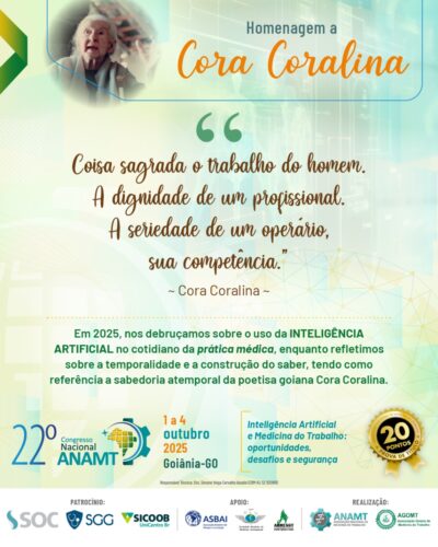 Com sua poesia e prosa singulares, a poetisa goiana Cora Coralina encantou e continua a encantar com sua obra de linguagem simples, com forte influência da cultura de Goiás e muitas observações sobre a condição humana e o valor do trabalho. O 22º Congresso Nacional ANAMT fará uma homenagem à escritora ao longo da programação do evento, que será realizado em Goiânia (GO), de 1º a 4 de outubro, sobre o tema ‘Inteligência Artificial e Medicina do Trabalho: oportunidades, desafios e segurança’.